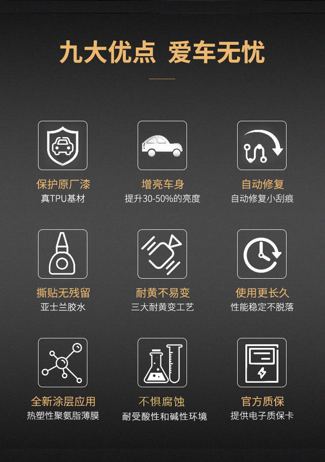 亮迪漆面保护膜采用北美原厂涂层自修复TPU基材技术,具有极强韧性,能有效的防止刮蹭乙级高速行驶中的小石子、沙粒对原厂车漆的伤害,阻隔紫外线、碰撞、虫尸斑、鸟粪等外界污染源对车身的腐蚀。
